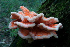 【性 状介绍】子实体大型。初期瘤状,似脑髓状,菌盖覆瓦状排列,肉质多汗干后轻而脆。菌盖宽8-30cm,厚1-2cm,表面硫磺色至鲜橙色,有细绒或无,有 皱纹,无环带,边缘薄而锐,波浪状至瓣裂。菌肉白色或浅黄色,管孔而硫磺色,干后褪色,孔口多角形,平均每毫米3-4个。此菌的重要特征是子实体瓦状排 列,硫磺色。