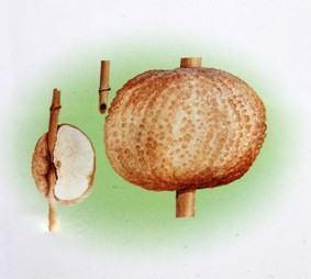 【性 状介绍】子座近球形,肉质,中等大。直径6-10(20)cm,新鲜时表面浅肉色,后变深色,内部白色,平滑且有突起。子囊壳埋生于子座内,呈多层排列, 椭圆形,卵圆形或近球形,720-780μm×480-590μm,壁呈肉桂色。子囊近圆柱形,有孢子部分135-150μm×16-19μm。每个子囊 内有孢子8个,单行排列。孢子广椭圆形,早期无色,后变成淡紫色,最后褐色,15-21μm×11-15μm,侧丝细长线形。