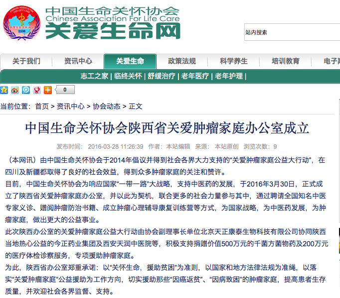 目 前,中国生命关怀协会为响应国家“一带一路”大战略,支持中医药的发展,于2016年3月30日,正式成立了陕西省关爱肿瘤家庭办公室,并以此为契机,联 合更多的社会力量参与其中,通过聘请全国知名中医专家义诊、赠阅肿瘤防治书籍、成立肿瘤心理辅导康复训练营等方式,为国家战略,为中医药发展,为肿瘤家 庭,做出更大的公益事业。